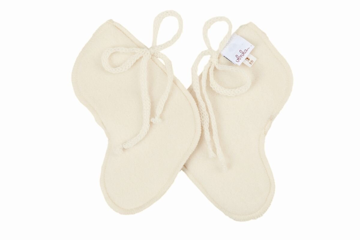 The design of the hat means that tiny ears are covered well. The hat can be tied under the chin to keep it on. The matching soft woollen mittens are great for cold winter days. The simple wrap-over Merino jacket will keep babies warm and snug, while the tiny socks made of Merino wool will keep their feet nice and toasty.